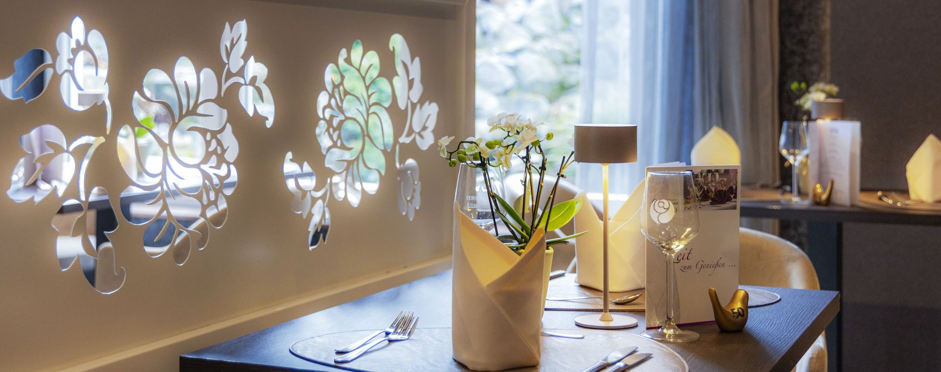 Das Kaminzimmer schließt sich direkt an unser Restaurant „Gartenblick“ an und hat einen wunderschönen Blick auf den asiatischen Wasserfall und Teich mit Wasserschildkröten. Der Raum hat einen Kamin, der in der kalten Jahreszeit für behagliche Wärme und gemütliche Atmosphäre sorgt. Durch eine große Glasschiebetür lässt sich das Kaminzimmer mit dem Restaurant verbinden, und ist ebenso als separater Raum nutzbar.